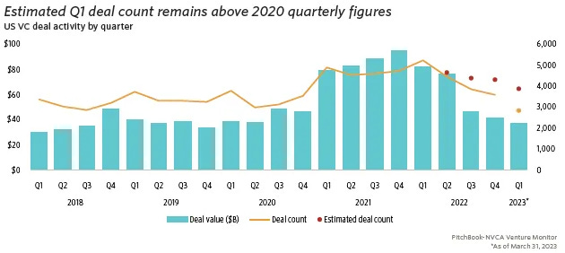 Venture capital is experiencing a pullback across stages and markets. Even with OpenAI and Stripe raising $16.5B in Q1 2023, global venture funding dropped year over year by 53%.